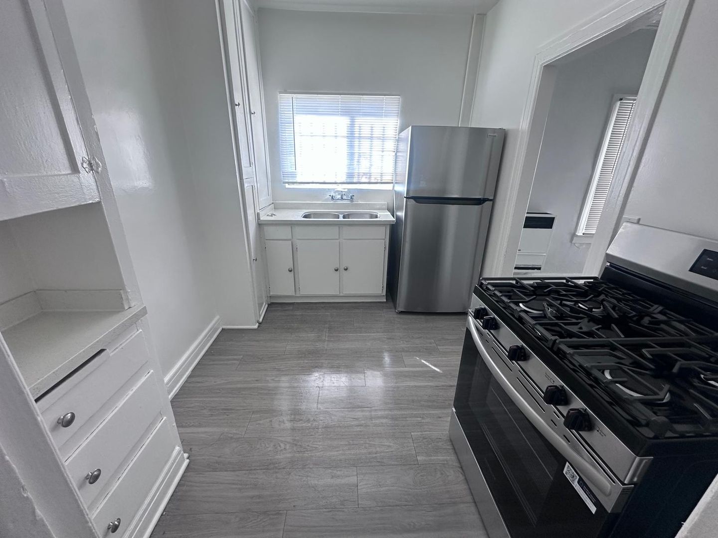 This 1 BR 1 BA unit comes with vinyl flooring, new paint throughout, new lighting, stainless steel appliances, and quality blinds throughout. The kitchen features a stove and fridge, white quartz countertops, stainless steel double sink, and a high-quality single-handle faucet.